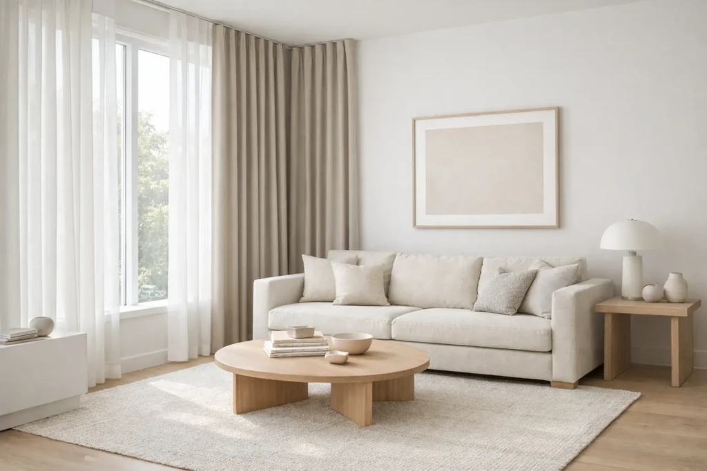 If your living room features clean lines and neutral tones, opt for sheer white or light gray curtains. Floor-to-ceiling panels create height and make the space feel larger.